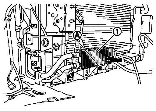 33.Remove mounting bolts (A), and then move power steering fluid cooler assembly (1) toward vehicle front.