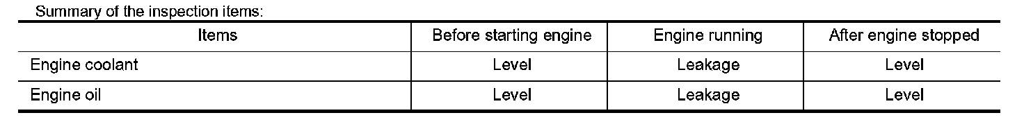 - Before starting engine, check oil/fluid levels including engine coolant and engine oil. If any are less than the required quantity, fill them to the specified level.