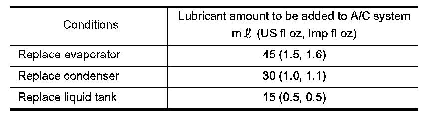 If lubricant amount that is drained from removed compressor is less than 60 m l (2.0 US fl oz, 2.1 Imp fl oz), perform calculation by setting "D" as 40 m l (1.4 US fl oz, 1.4 Imp fl oz).