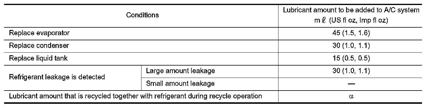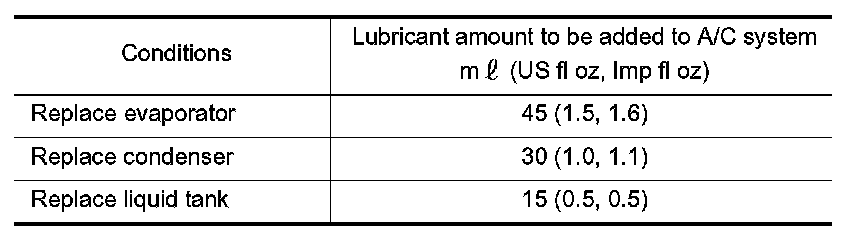 Example: Lubricant amount to be added when replacing evaporator and liquid tank [ml (US fl oz, Imp fl oz)] = 45 (1.5, 1.6) + 15 (0.5, 0.5) + alpha