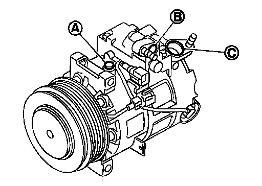3.Drain lubricant from high-pressure port (B) and low-pressure port (C) while rotating magnet clutch.