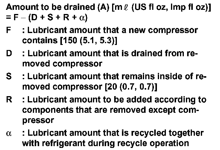 Example: Lubricant amount to be drained from a new compressor when replacing compressor and liquid tank [ml (US fl oz, Imp fl oz)] [D = 60 (2.0, 2.1), alpha = 5 (1.4, 1.4)] 150 (5.1, 5.3) - [60 (1.5, 1.6) + 20 (0.7, 0.7) + 15 (0.5, 0.5) + 5 (0.2, 0.2)] = 50 (1.7, 1.8)
