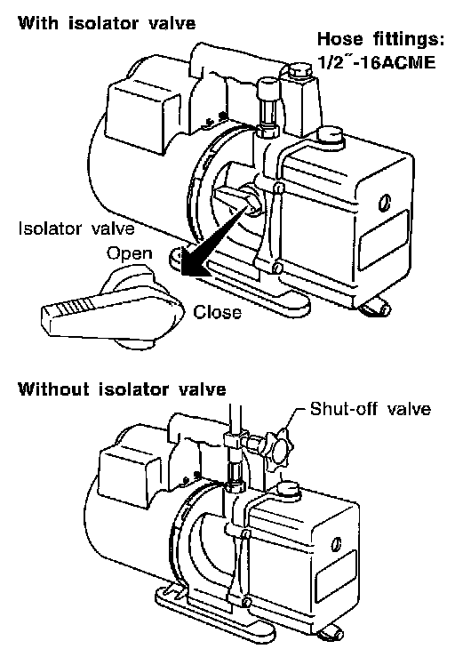 - Vacuum pumps usually have a manual isolator valve as part of the pump. Close this valve to isolate the service hose from the pump.