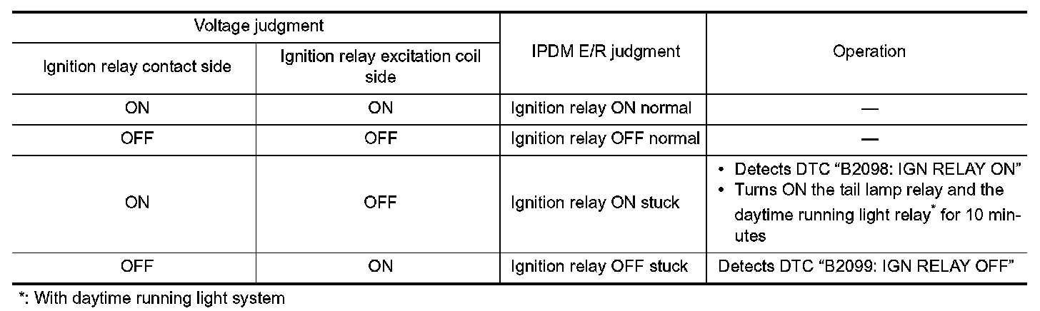 - IPDM E/R judges the ignition relay error if the voltage differs between the contact circuit and the excitation coil circuit.