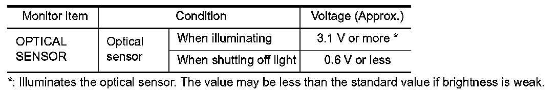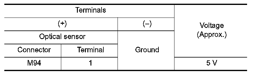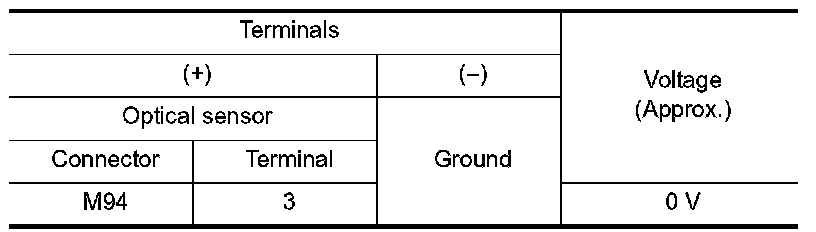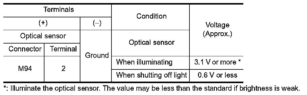With illuminating the optical sensor, check the voltage between the optical sensor harness connector and the ground.