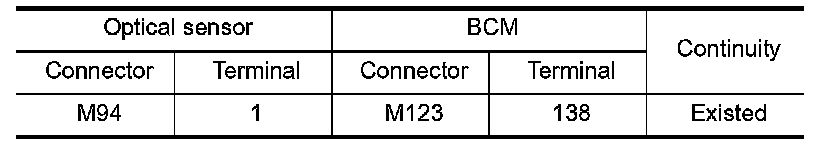 3.Check continuity between the optical sensor harness connector and the BCM harness connector.