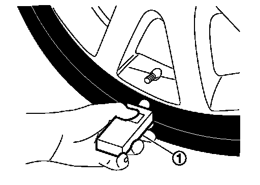 3.Contact the tire pressure sensor activation tool (J-45295) (1) to the side of the tire at the location to the tire pressure sensor.