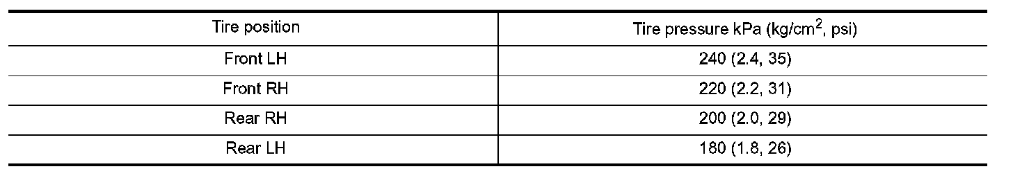 4.Adjust the tire pressures for all wheels to the specified value. [1][2]Specifications.