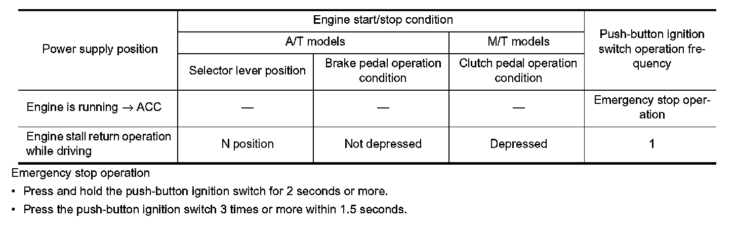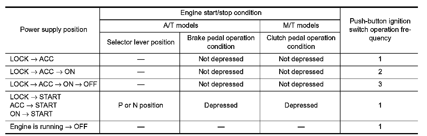 POWER SUPPLY POSITION CHANGE TABLE BY PUSH-BUTTON IGNITION SWITCH OPERATION