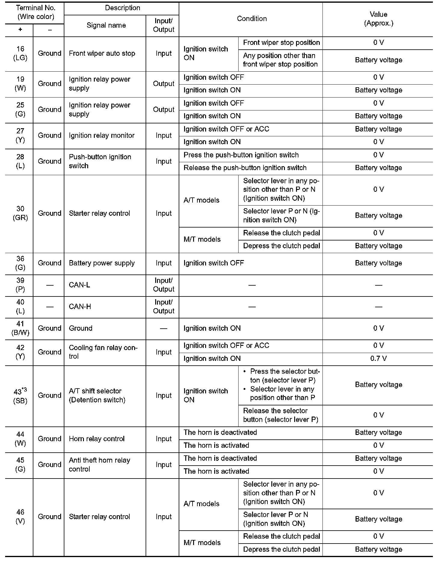Pinout Values and Diagnostic Parameters