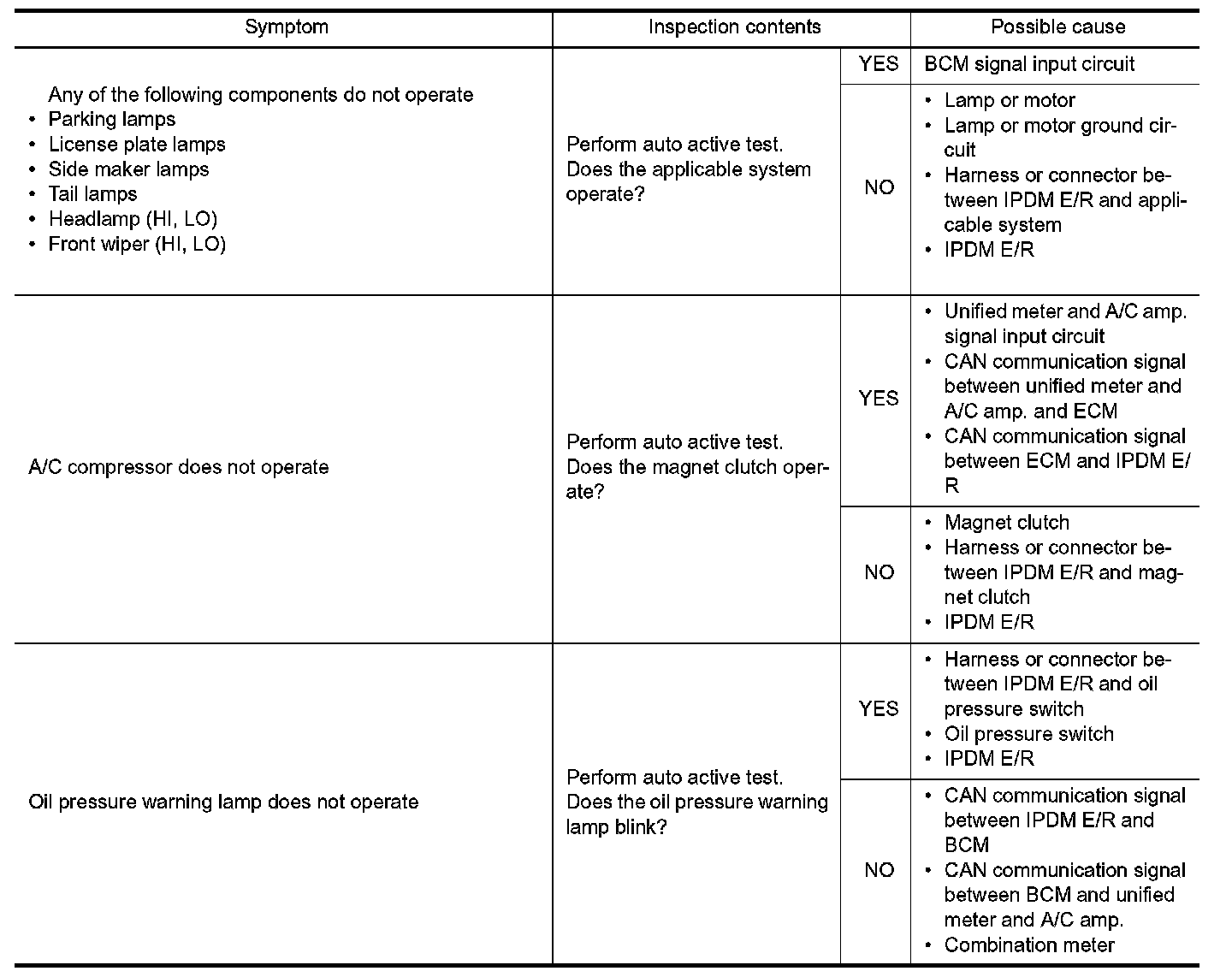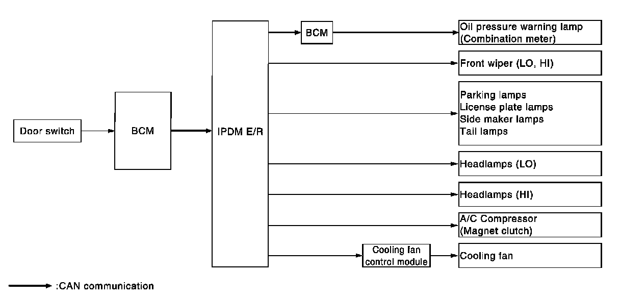 - IPDM E/R starts the auto active test with the door switch signals transmitted by BCM via CAN communication. Therefore, the CAN communication line between IPDM E/R and BCM is considered normal if the auto active test starts successfully.