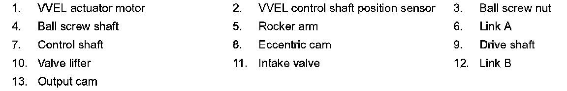 VVEL (Variable Valve Event & Lift) is a system that controls valve event and valve lift continuously. Rotational movement of the drive shaft equipped with eccentric cam is transmitted to output cam via the rocker arm and two kinds of links to depress the intake valve. ECM decides the target valve lift according to the driving condition and sends the command signal to the VVEL control module. The VVEL control module controls the rotation of the control shaft using the VVEL actuator motor and changes the movement of the output cam by shifting the link supporting point. As a result, valve lift changes continuously to improve engine output and response.