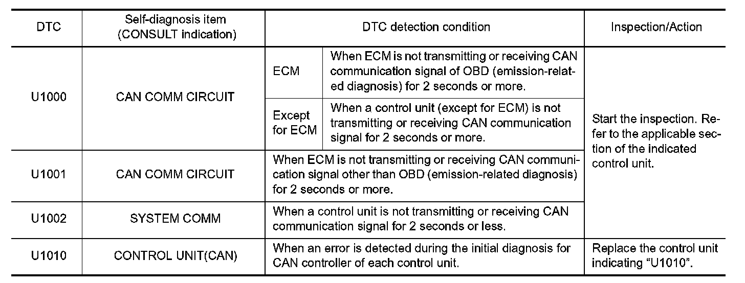 If communication signals cannot be transmitted or received among units communicating via CAN communication line, CAN communication-related DTC is displayed on the CONSULT "Self Diagnostic Result" screen.