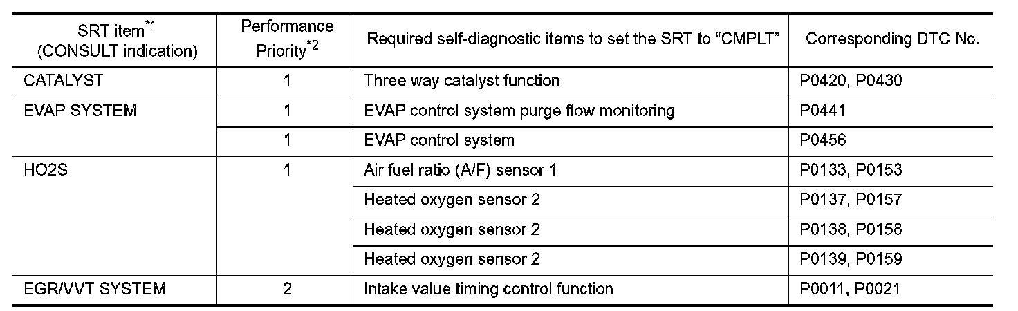 *2: If completion of several SRTs is required, perform driving patterns (DTC confirmation procedure), one by one based on the priority for models with CONSULT.