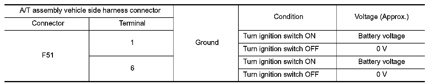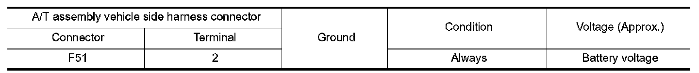 Check voltage between A/T assembly vehicle side harness connector terminals and ground.