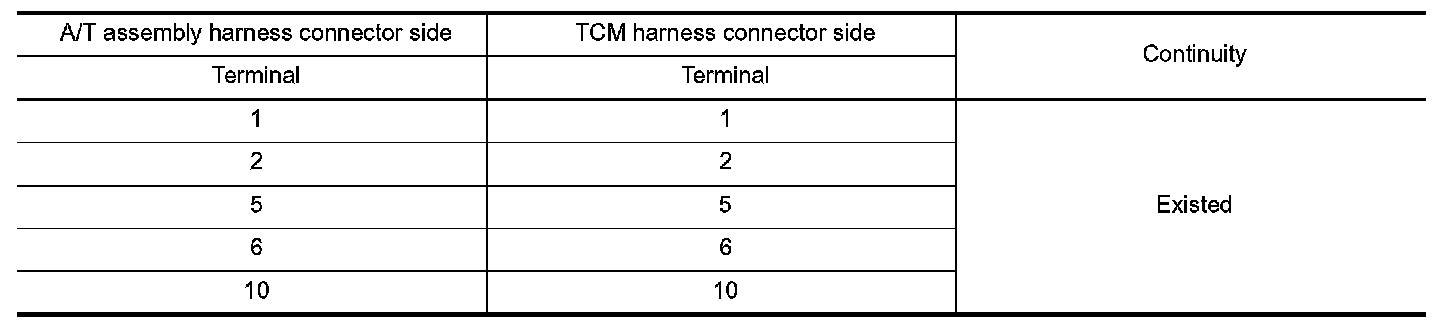 Check continuity between A/T assembly vehicle side harness connector terminals and ground.