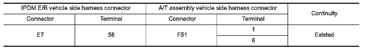 3.Check continuity between IPDM E/R vehicle side harness connector terminal and A/T assembly vehicle side harness connector terminals.