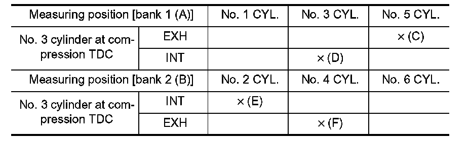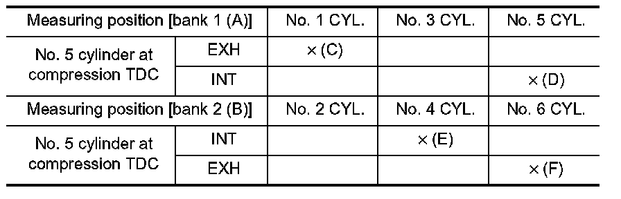 - By referring to the figure, measure the valve clearances at locations marked "x" as shown in the table below (locations indicated in the figure).