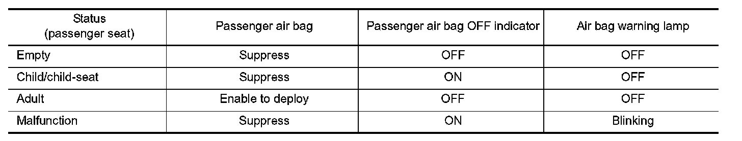 - Turns on passenger air bag OFF indicator when passenger seat is occupied by child-seat and child.