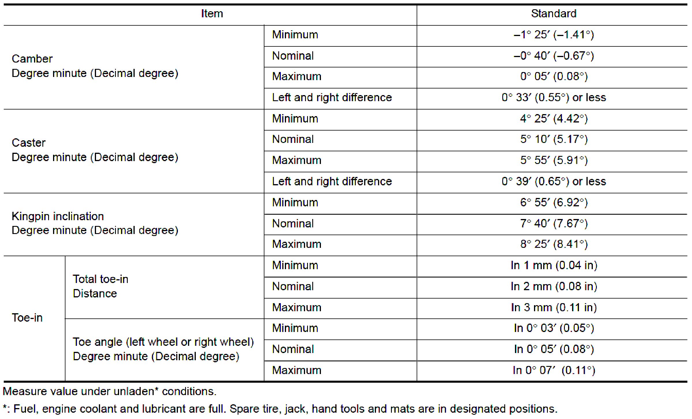 Wheel Alignment Specifications