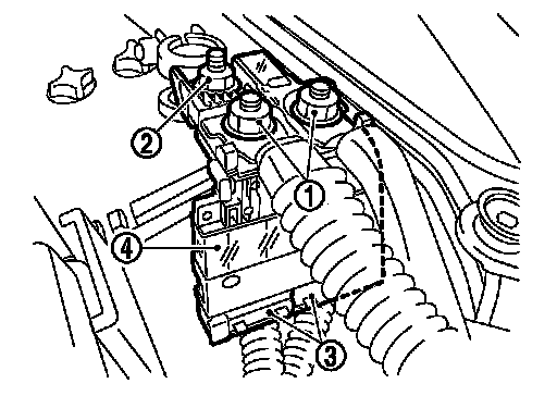 5.Disconnect harness connector (3) and remove battery terminal with fusible link (4).