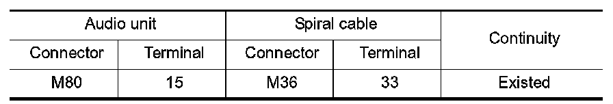 3.Check continuity between audio unit harness connector and spiral cable harness connector.