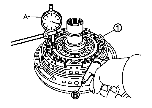 brake oil pressure hole (B), and measure 2346 brake clearance. If clearance is outside the specified value, adjust clearance by selecting an appropriate snap ring (1). Oil Channel.