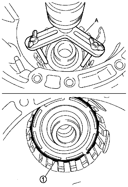 13.Set the clutch spring compressor [SST: KV-31102400 (J-34285 and J-34285-87)] (A) on reverse brake spring retainer and install snap ring (fixing spring retainer) (1) to transmission case while compressing return spring.