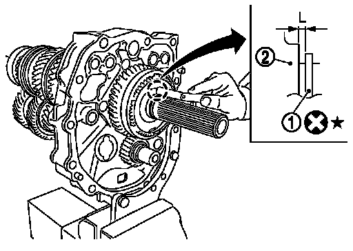 9.Select and install snap ring (1) so that the end play "L" of mainshaft is adjusted to the standard value. For selecting snap ring, refer to the latest parts information.