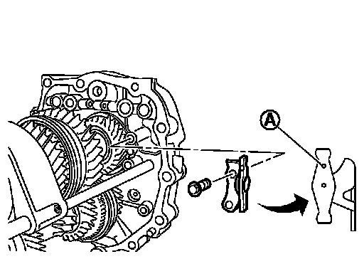 - Assemble retaining pin from the direction shown by the arrow in the figure until it becomes flush with the end surface of 5th-6th fork rod bracket.