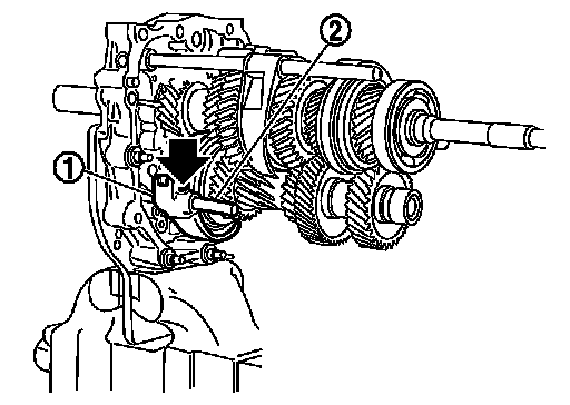 3.Install 5th-6th fork rod bracket (1) and 5th-6th fork rod (2) and then install retaining pin (black arrow) to 5th-6th fork rod bracket, using a pin punch [Commercial service tool].