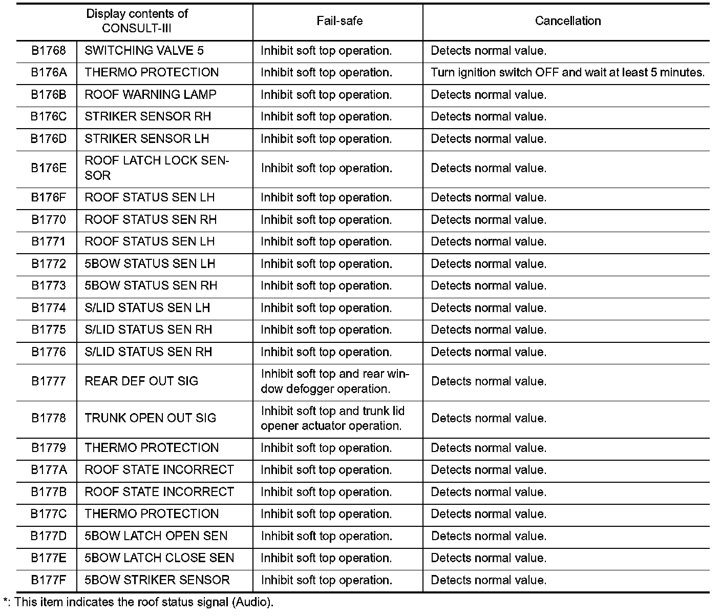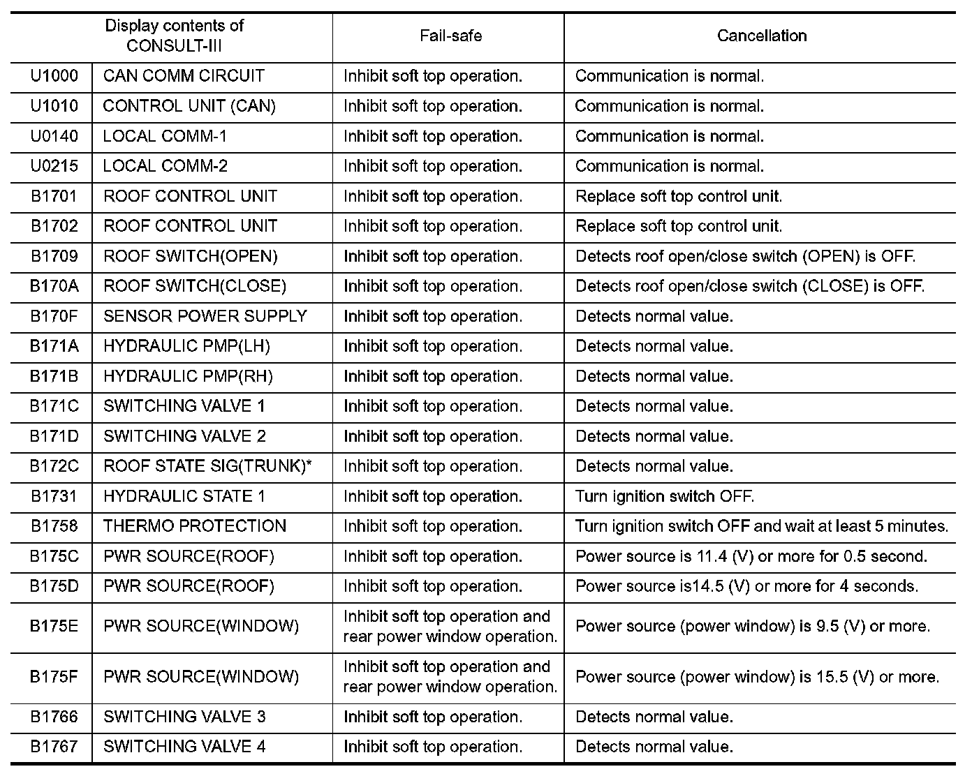Soft top control unit performs fail-safe control when any of the following DTCs is detected.