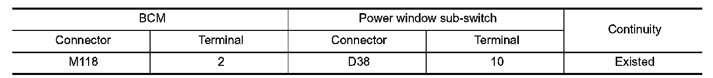 3.Check continuity between BCM harness connector and power window sub-switch harness connector.