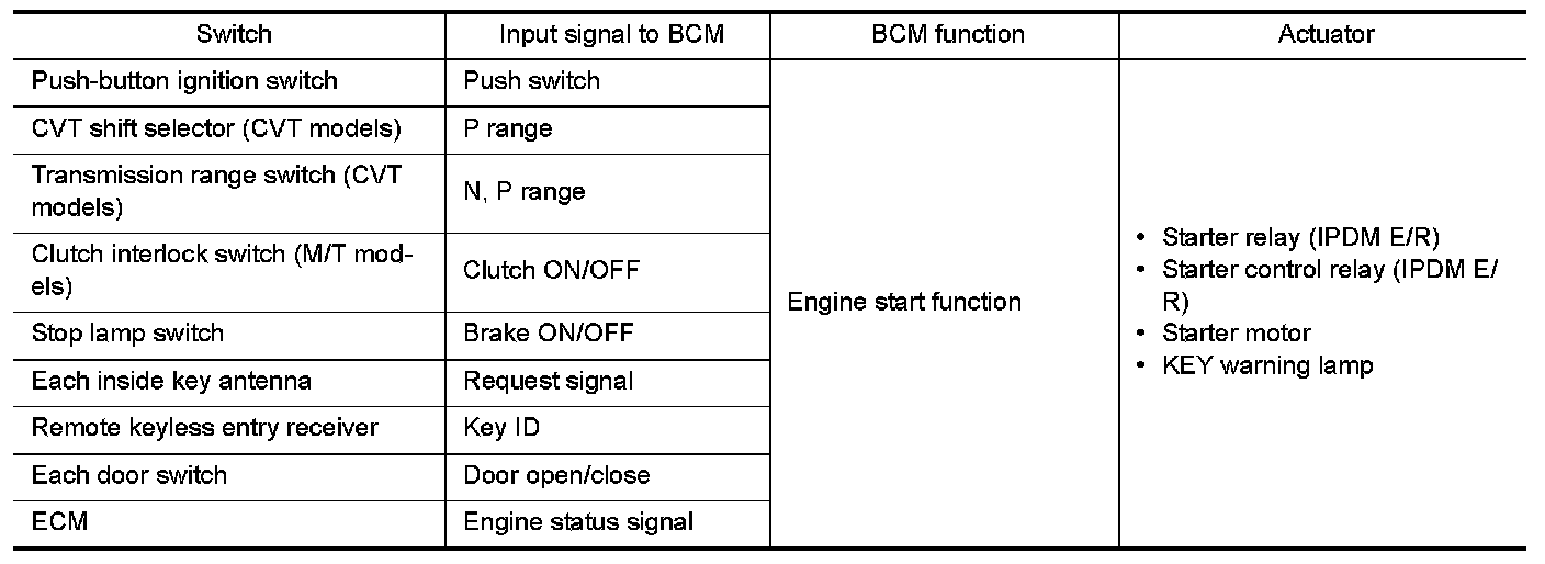 - When starting the engine, the BCM monitors under the engine start conditions, - Brake pedal operating condition (CVT models)