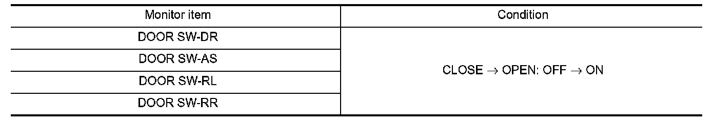 Check door switches DOOR SW-DR, DOOR SW-AS, DOOR SW-RL, DOOR SW-RR in Data Monitor mode with CONSULT.