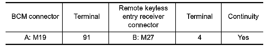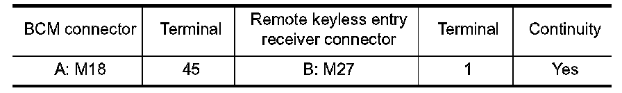 1.Check continuity between BCM connector and remote keyless entry receiver connector.