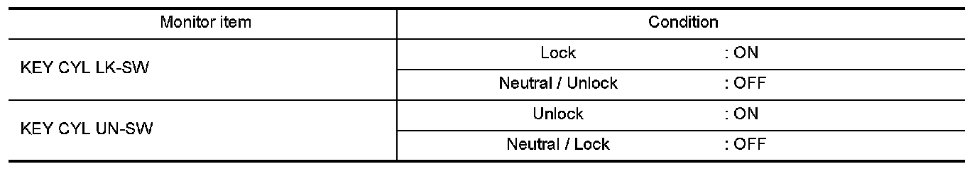 Check KEY CYL UN-SW, KEY CYL UN-SW in "DATA MONITOR" mode for "POWER DOOR LOCK SYSTEM" with CONSULT. Door Lock.