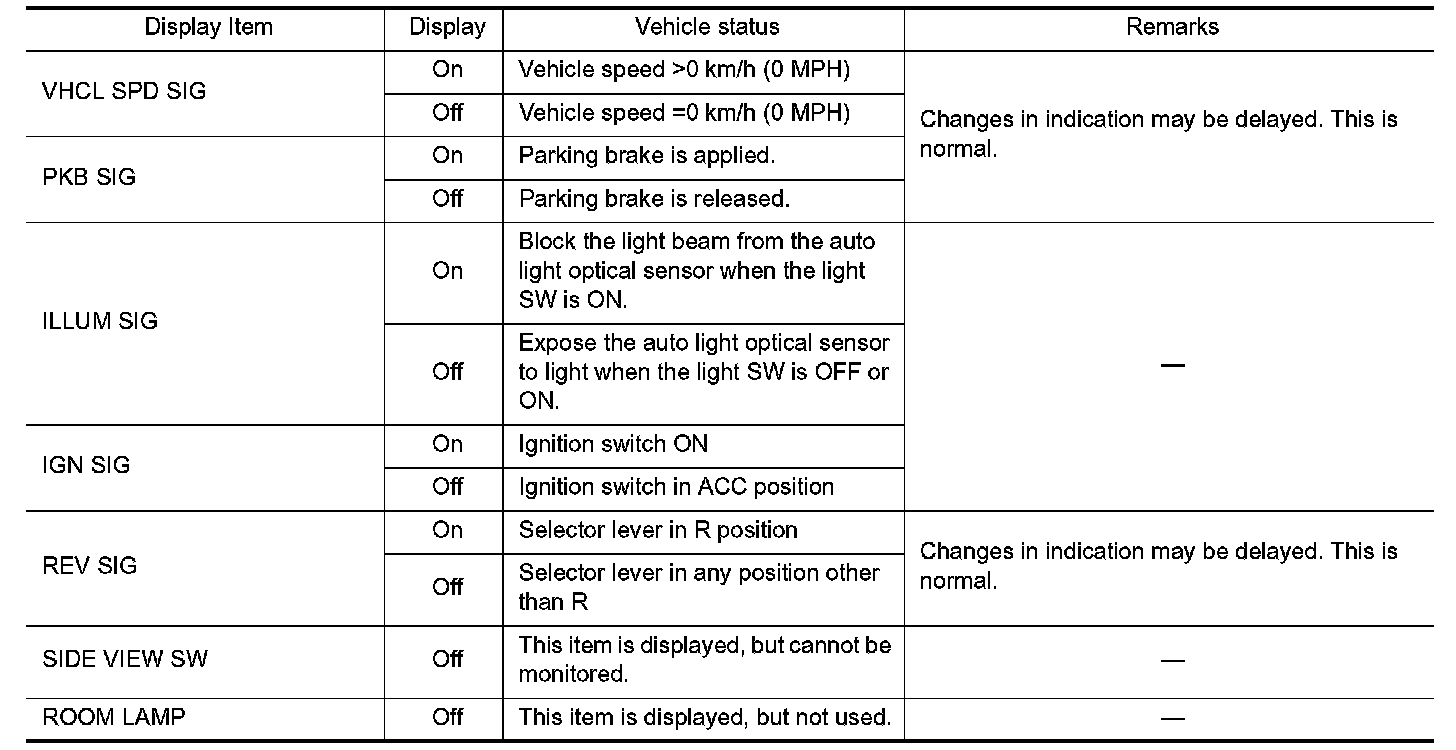 - Displays the status of the following vehicle signals inputted into the AV control unit.