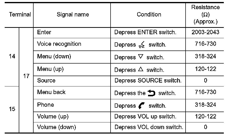 When one of the steering wheel audio control switches is pushed, the resistance in the steering wheel audio control switch circuit changes, depending on which button is pushed.