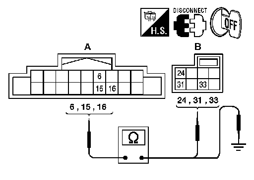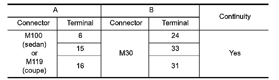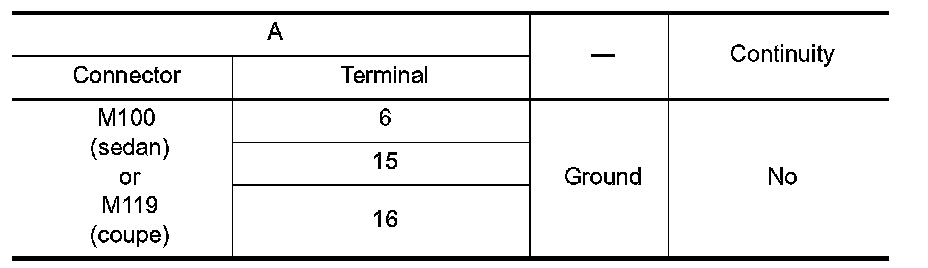 3.Check continuity between AV switch connector M100 (sedan) or M119 (coupe) (A) and ground.