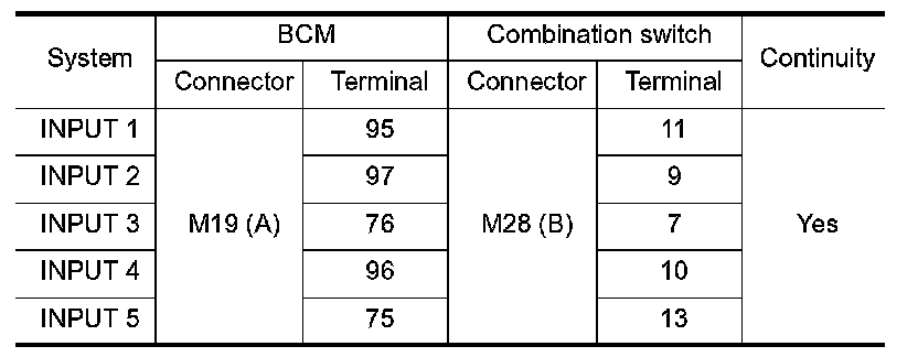 3.Check continuity between BCM harness connector and combination switch harness connector.