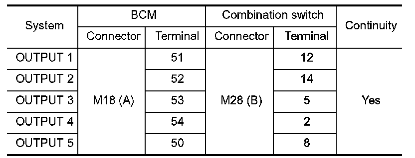 3.Check continuity between BCM harness connector and combination switch harness connector.