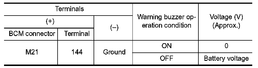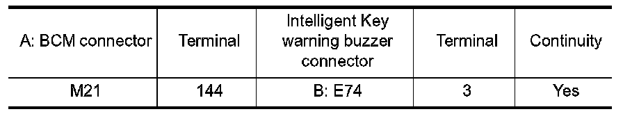 2.Check continuity between BCM connector and Intelligent Key warning buzzer connector.