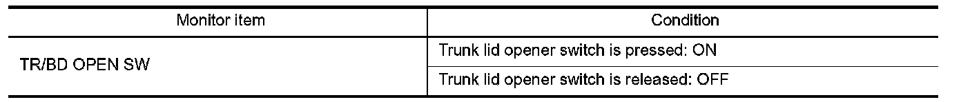 Check trunk lid opener switch TR/BD OPEN SW in Data Monitor mode with CONSULT.