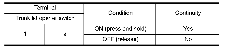 3.Check continuity between trunk lid opener switch connector.
