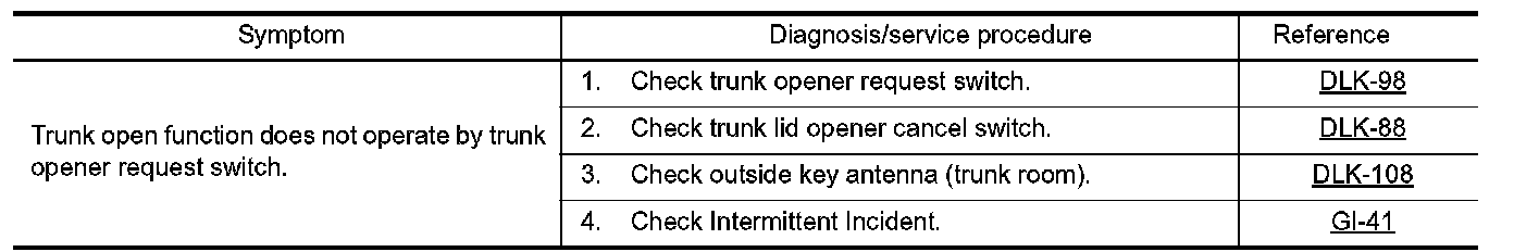 - If the following "symptoms" are detected, check systems shown in the "Diagnosis/service procedure" column in this order.