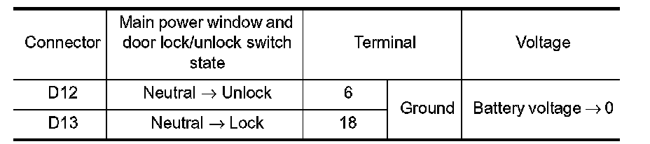2.Check voltage at the main power window and door lock/unlock switch connector when the switch (driver side) is turned to