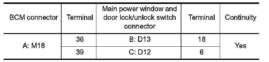 2.Check continuity between BCM connector and main power window and door lock/unlock switch connector.