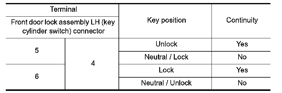 Check front door lock assembly LH (key cylinder switch).