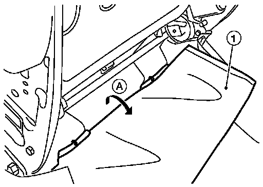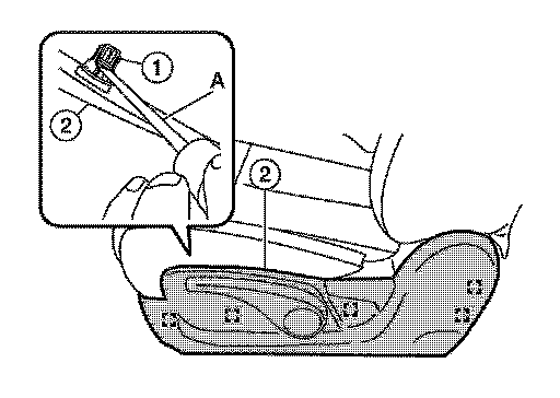 SE iii.Insert a suitable tool (A) between the seat cushion and the seat side finisher (2), then release the five metal clips. Push the finger (1) of each metal clip to release it from the seat cushion frame.